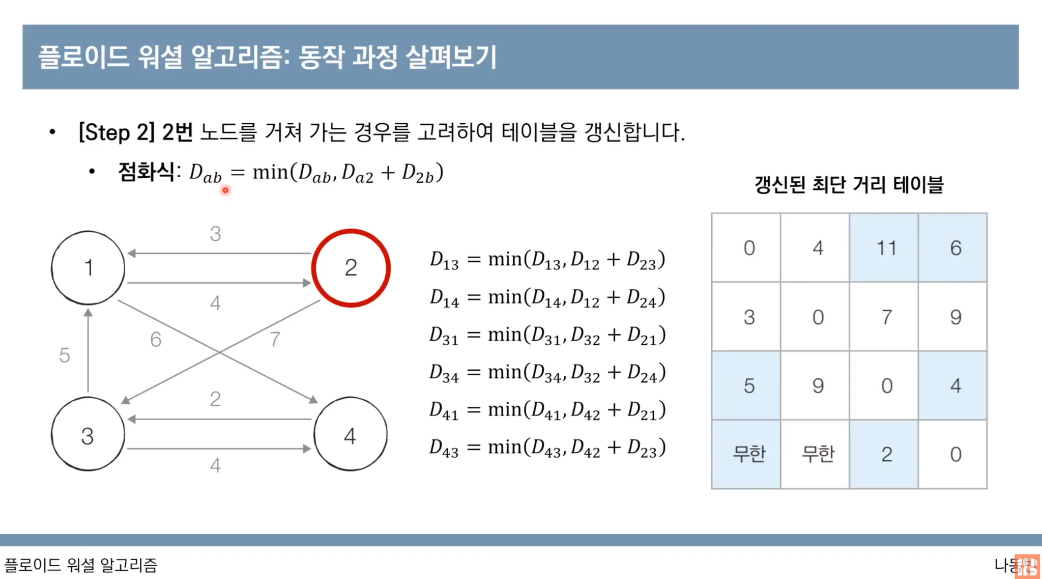 이 과정을 반복하여 이번에는 2번 노드를 거쳐 가는 경우에도 행렬을 업데이트 합니다.