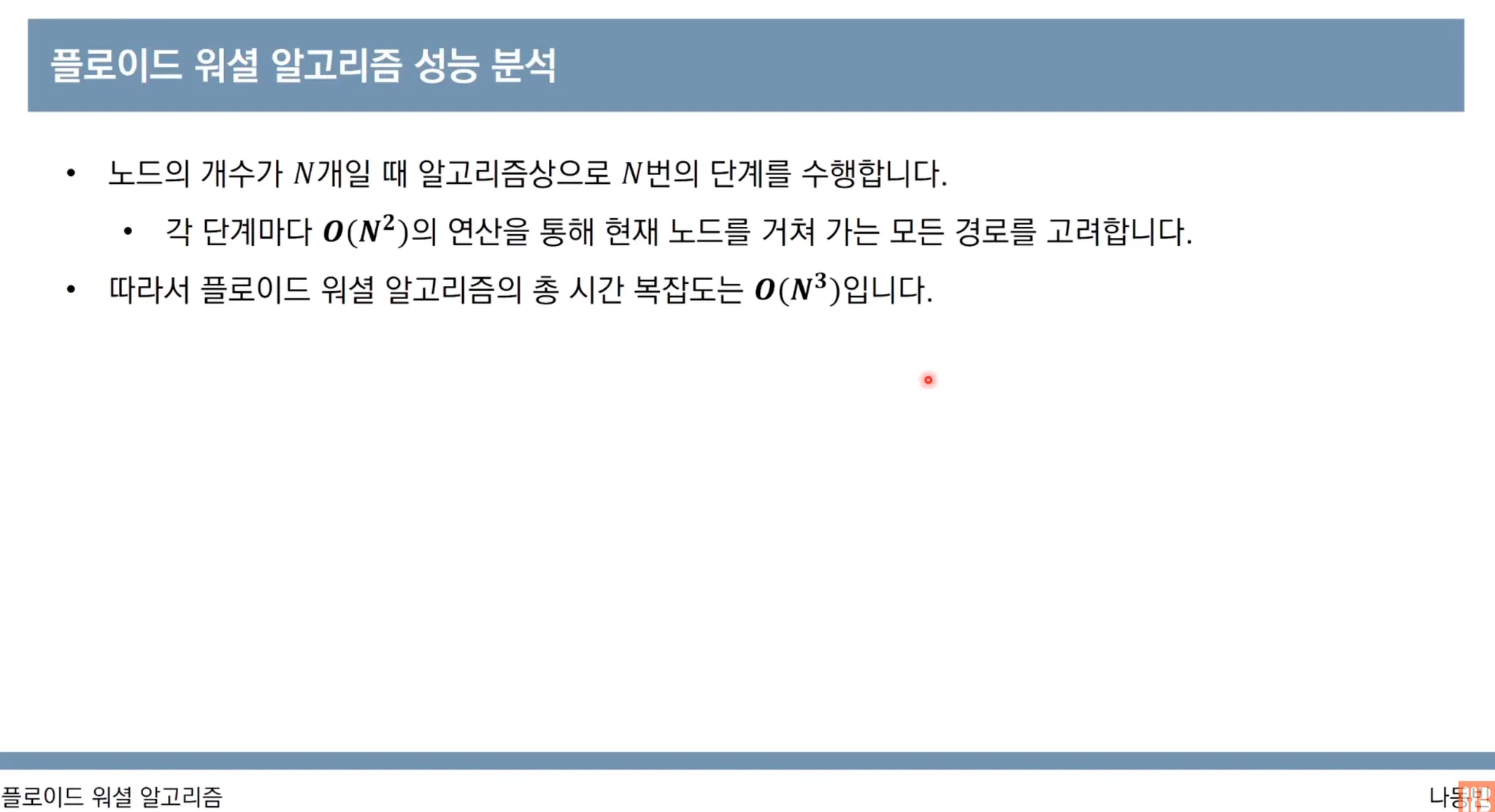 따라서 플로이드-워셜 알고리즘의 시간복잡도는 O(n^3) 입니다