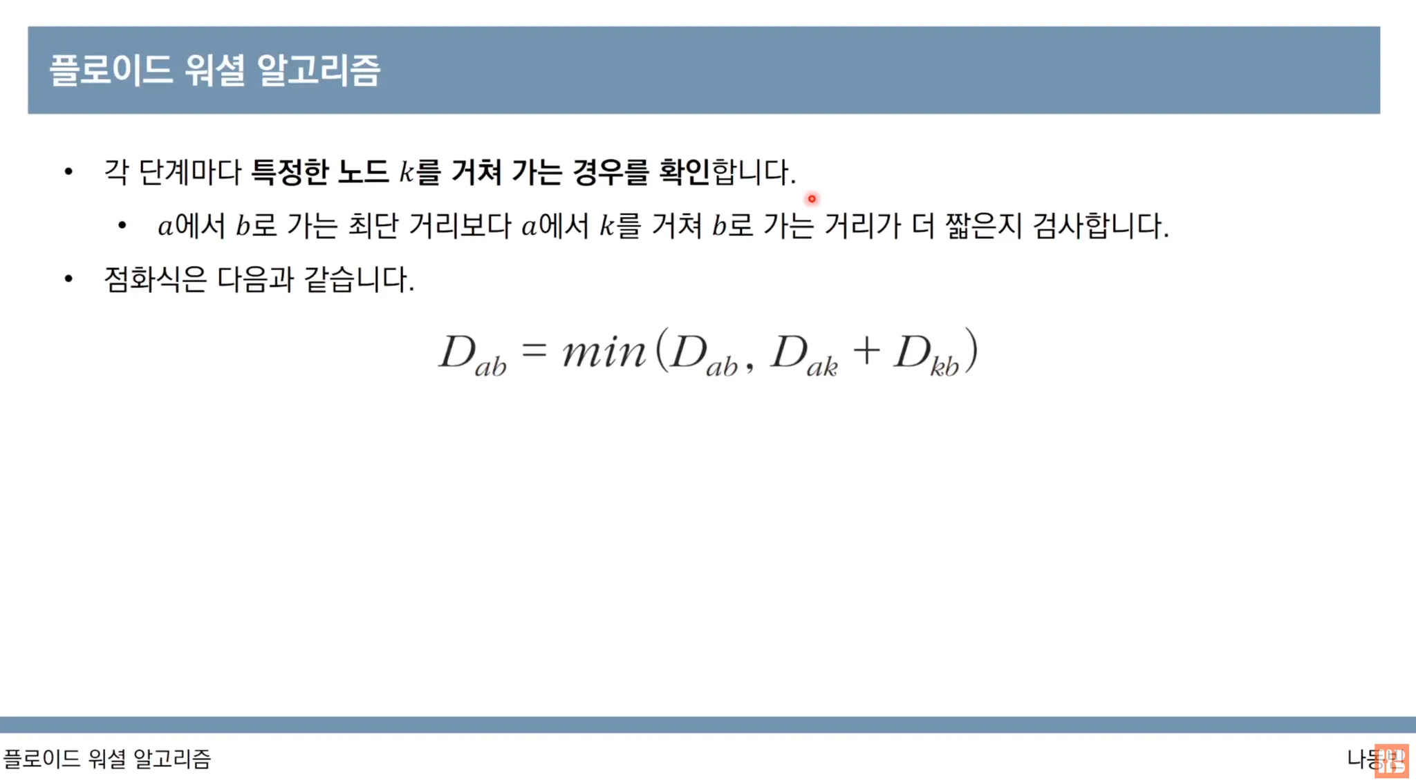 플로이드-워셜 알고리즘은 a → b로 가는 비용과 a → k → b로 가는 비용 중 더 적은 것을 최단 거리로 설정합니다. 그래서 다음과 같은 점화식을 만들 수 있습니다
