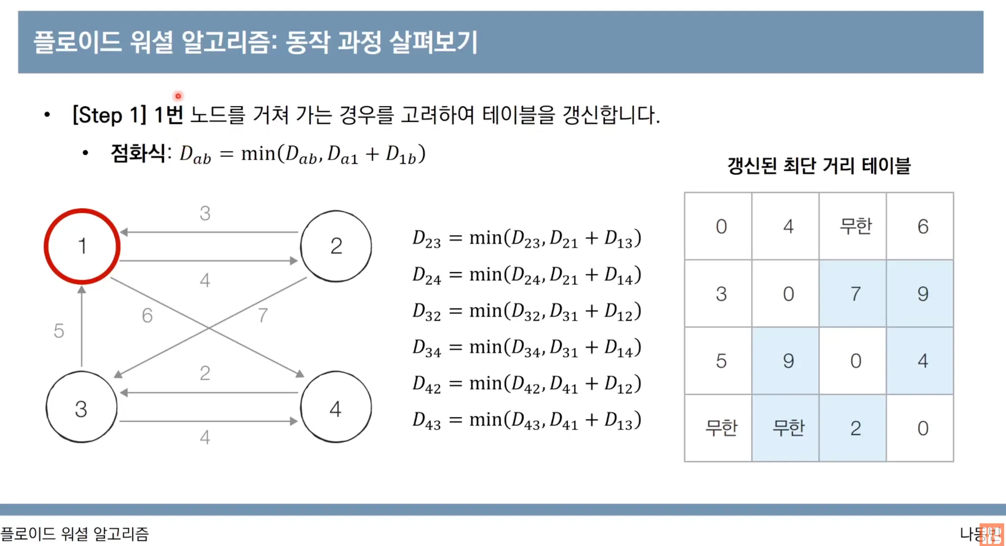 그리고 1번 노드를 거쳐 가는 경우에 min(a → b, a → 1 → b)를 계산하여 행렬을 갱신합니다.