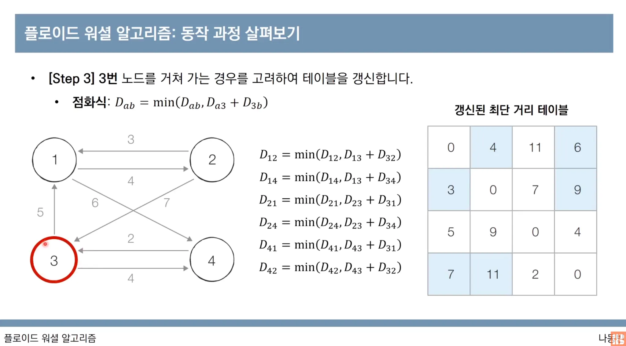 3번 노드를 거쳐 가는 경우의 행렬 업데이트 과정을 진행합니다.