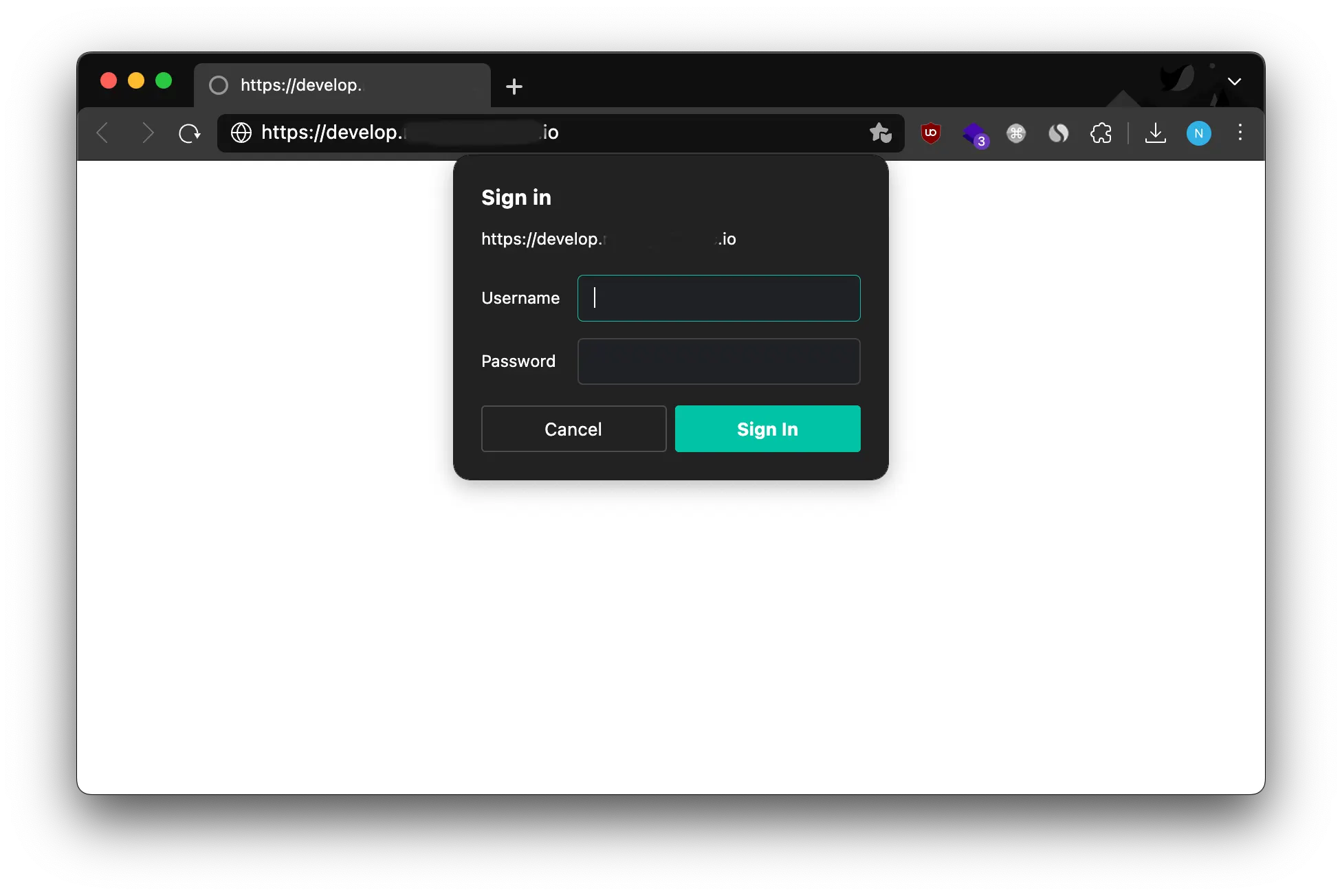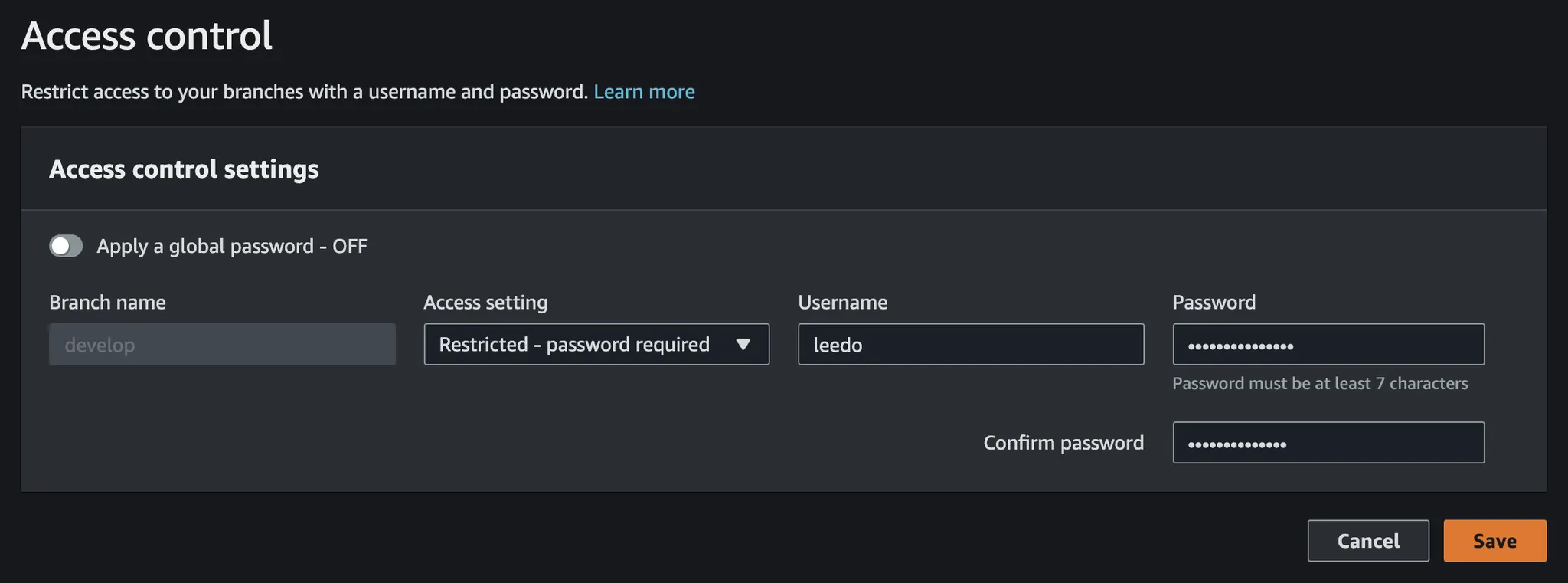 Amplify에서 웹사이트에 아이디, 비밀번호를 설정할 수도 있습니다. 인가되지 않은 사람들이 접속을 하지 못하도록 설정하는 가장 쉬운 방법입니다. 아이디, 비밀번호를 입력하기 전까지 어떠한 파일(HTML, JS, CSS)도 받아오지 않습니다.
