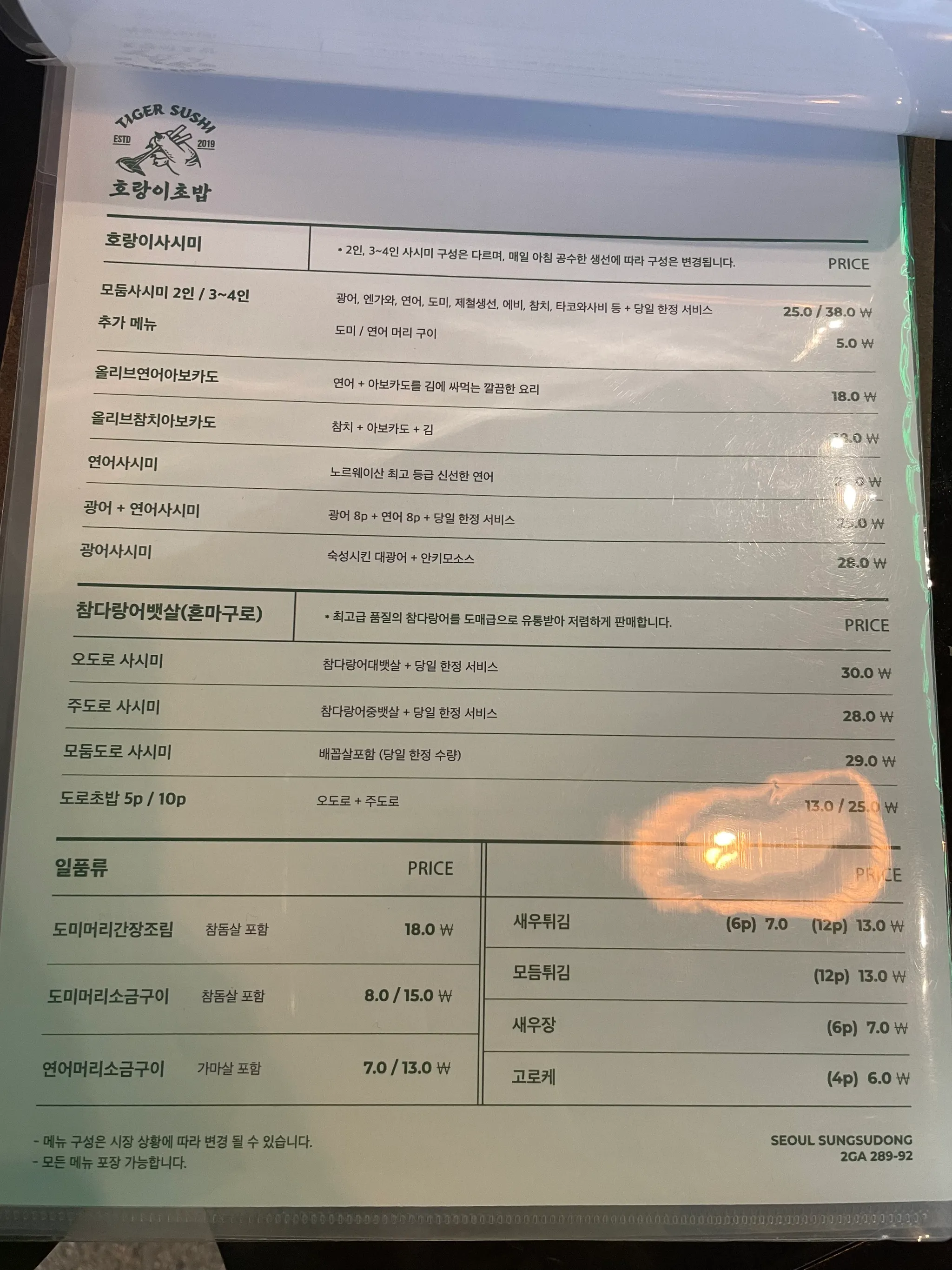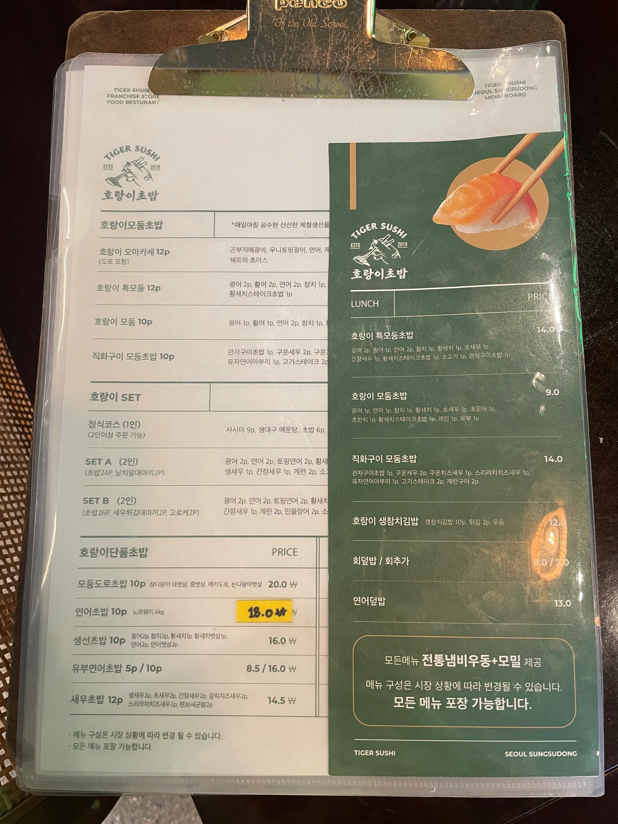 메뉴판입니다. 호랑이 모둠초밥이랑 고로케를 주문했습니다.