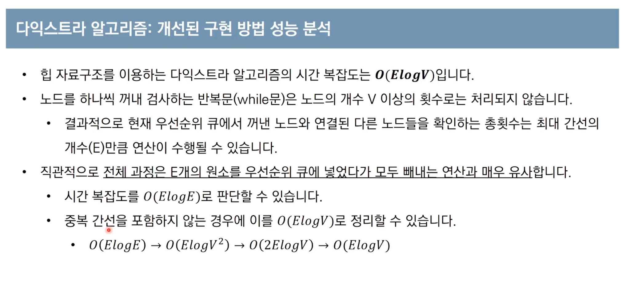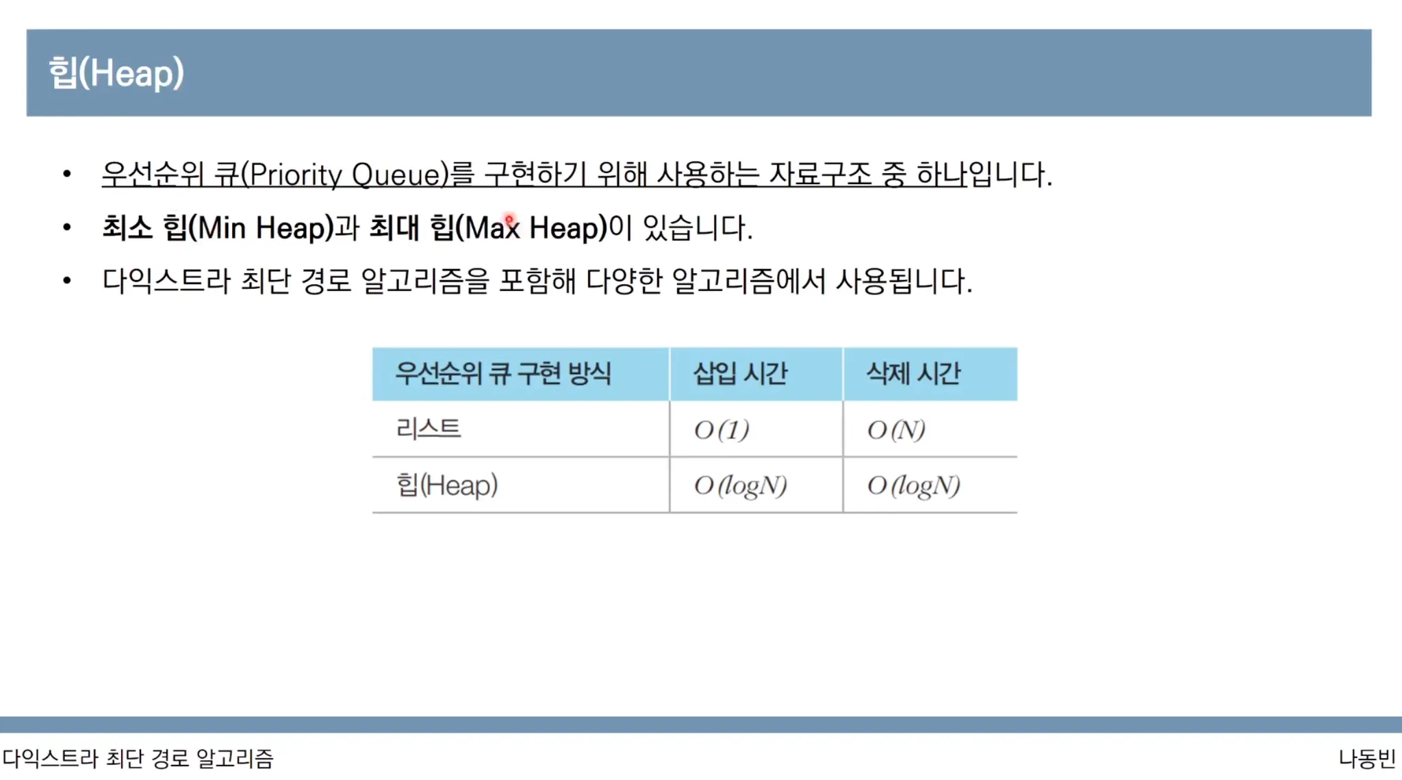 우선순위 큐(힙)를 사용하여 구현한 다익스트라 알고리즘의 시간 복잡도는 O(N*logN) 입니다