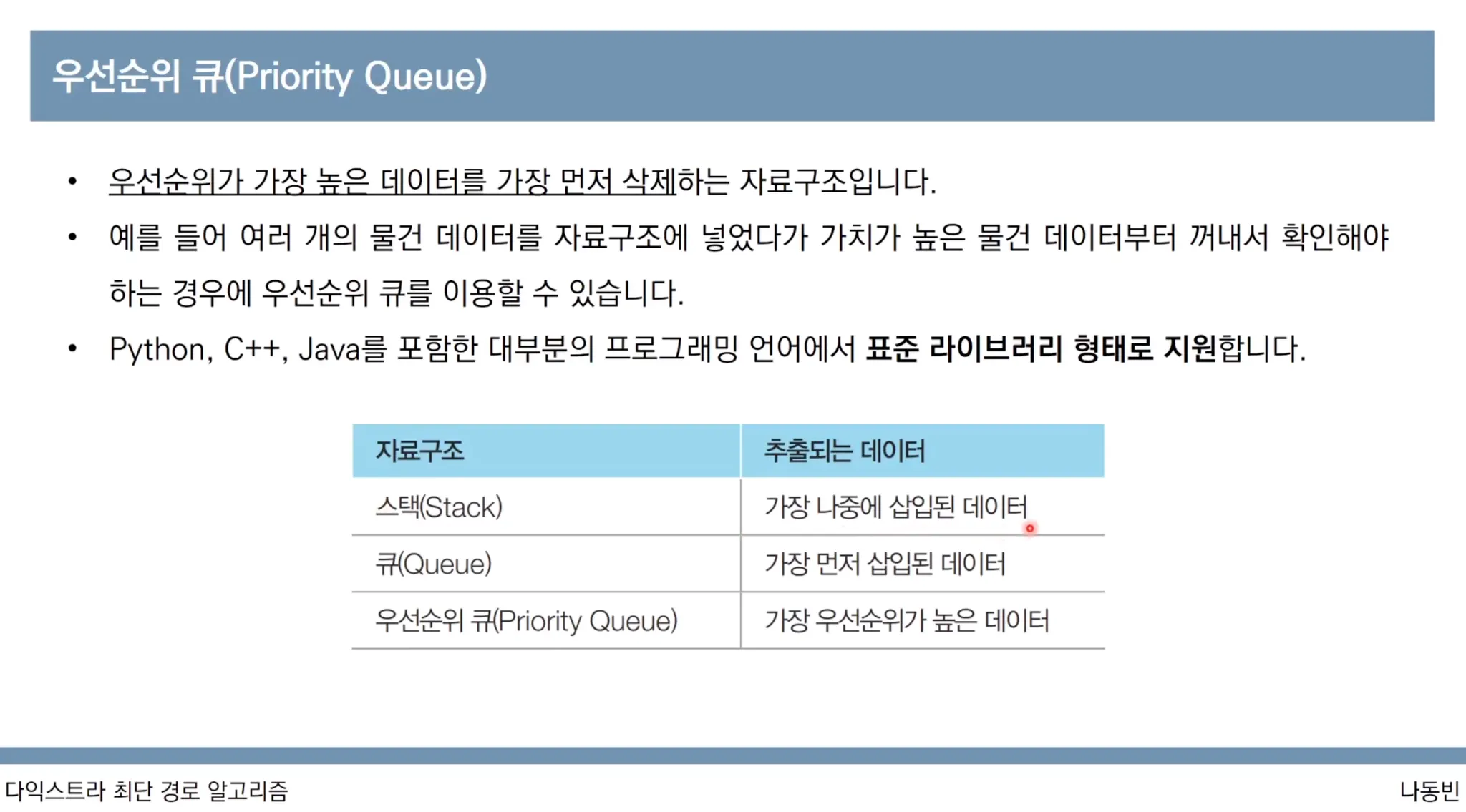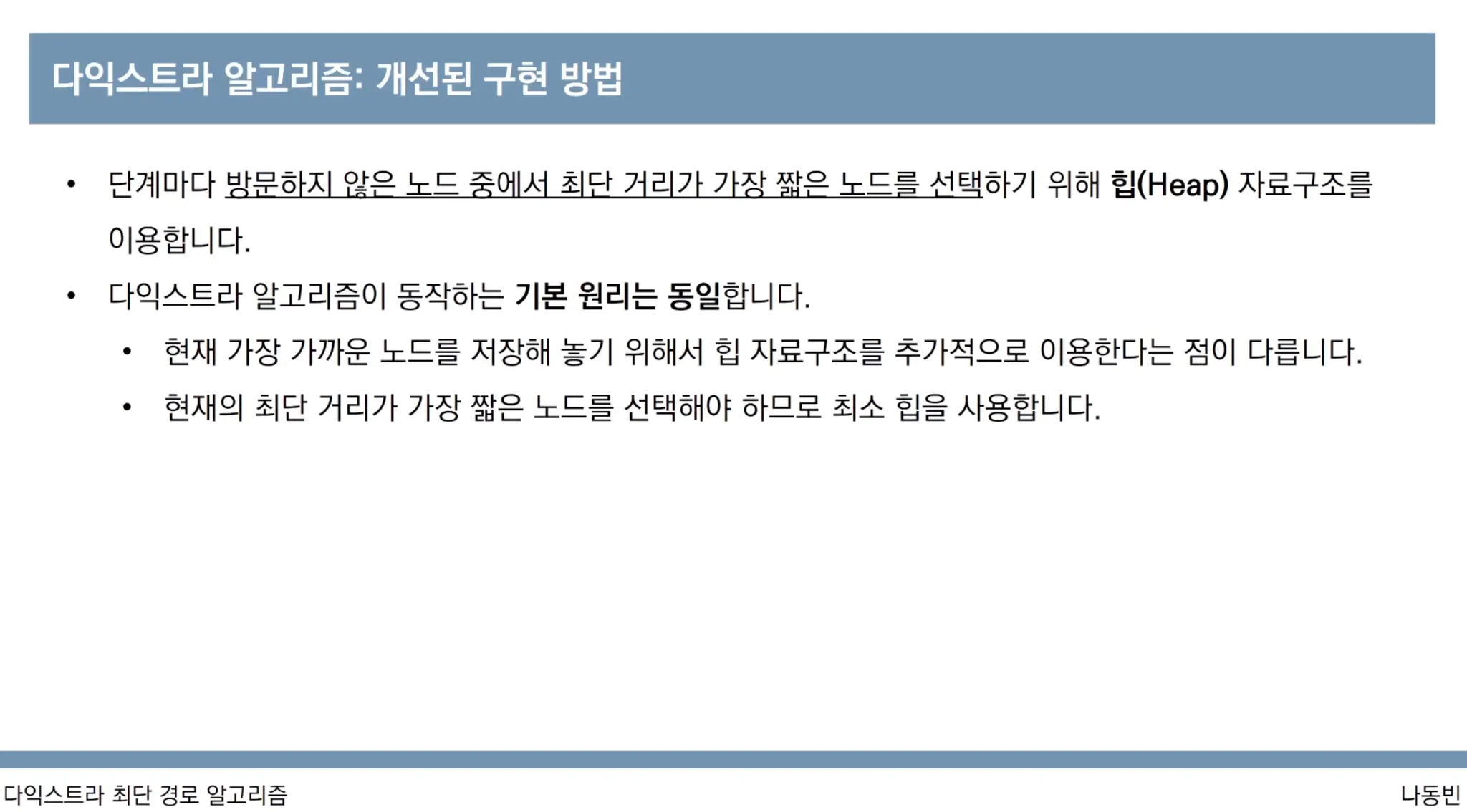 방문하지 않은 노드 중에서 최단 거리가 가장 짧은 노드를 우선순위 큐에서 탐색하여 탐색시간을 O(logN)으로 줄입니다. 순차 탐색의 경우 O(n)이었습니다.