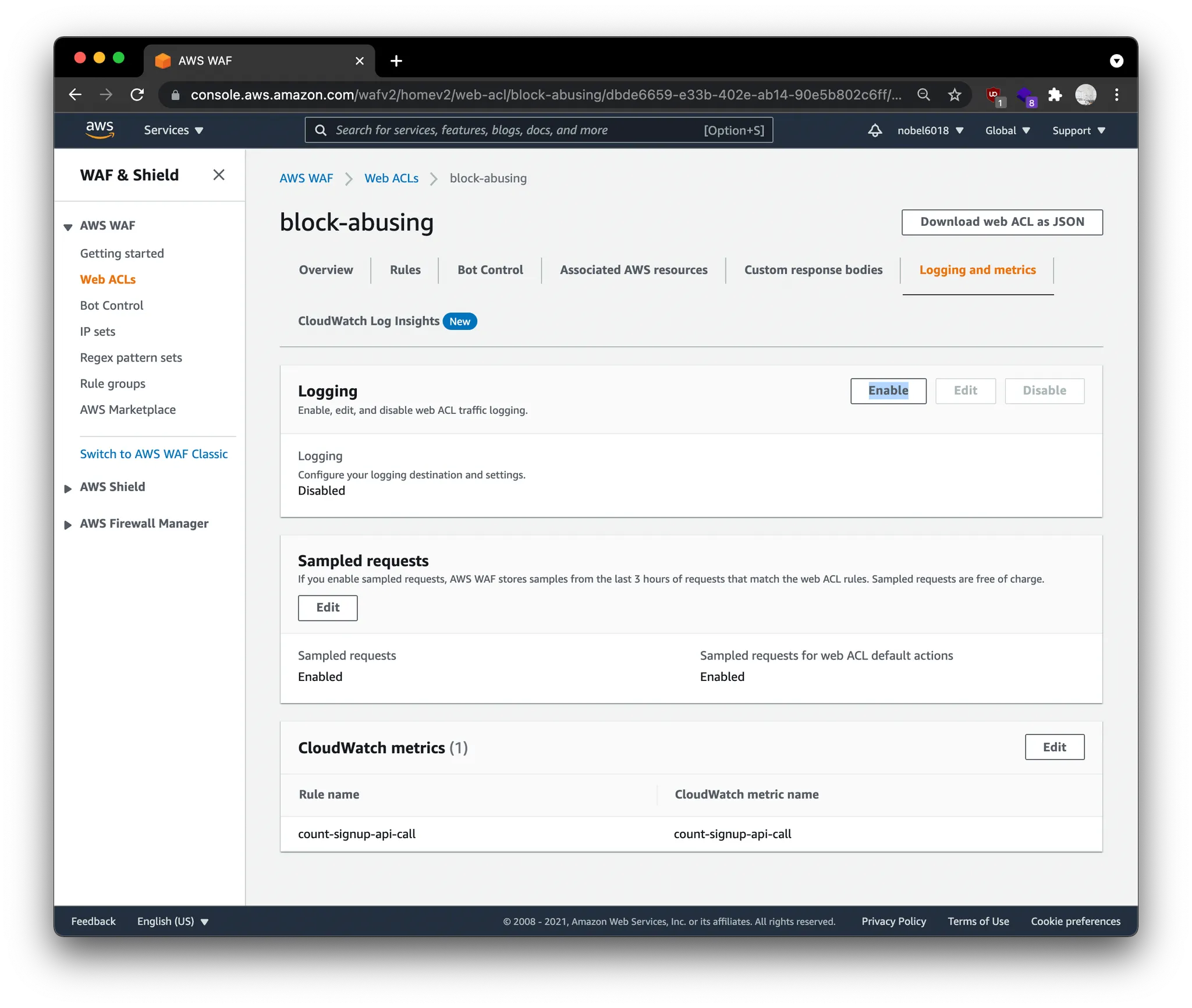 해당 ACL로 들어가서 Loggin and metrics 탭으로 이동하고 로깅을 활성화 합니다