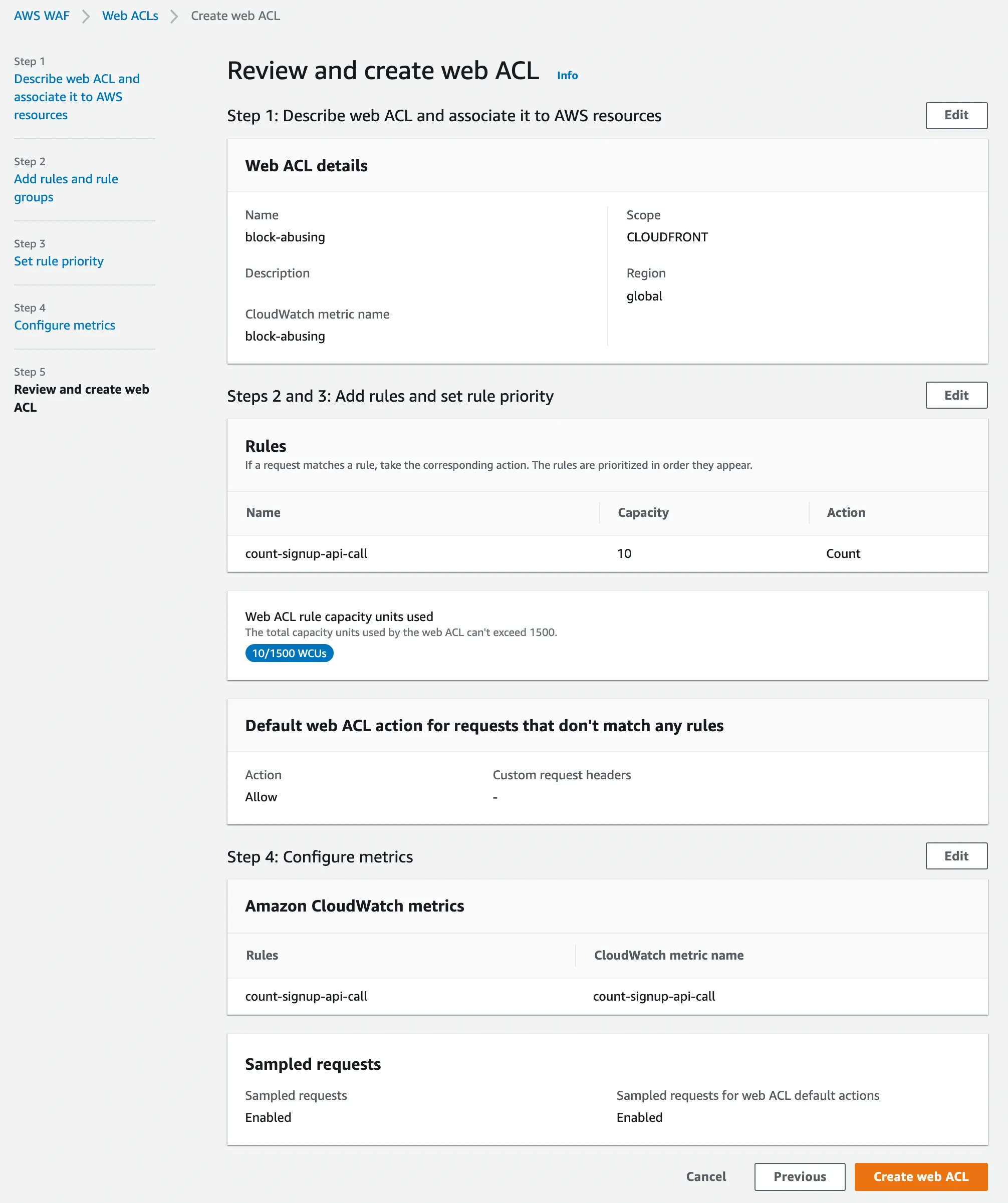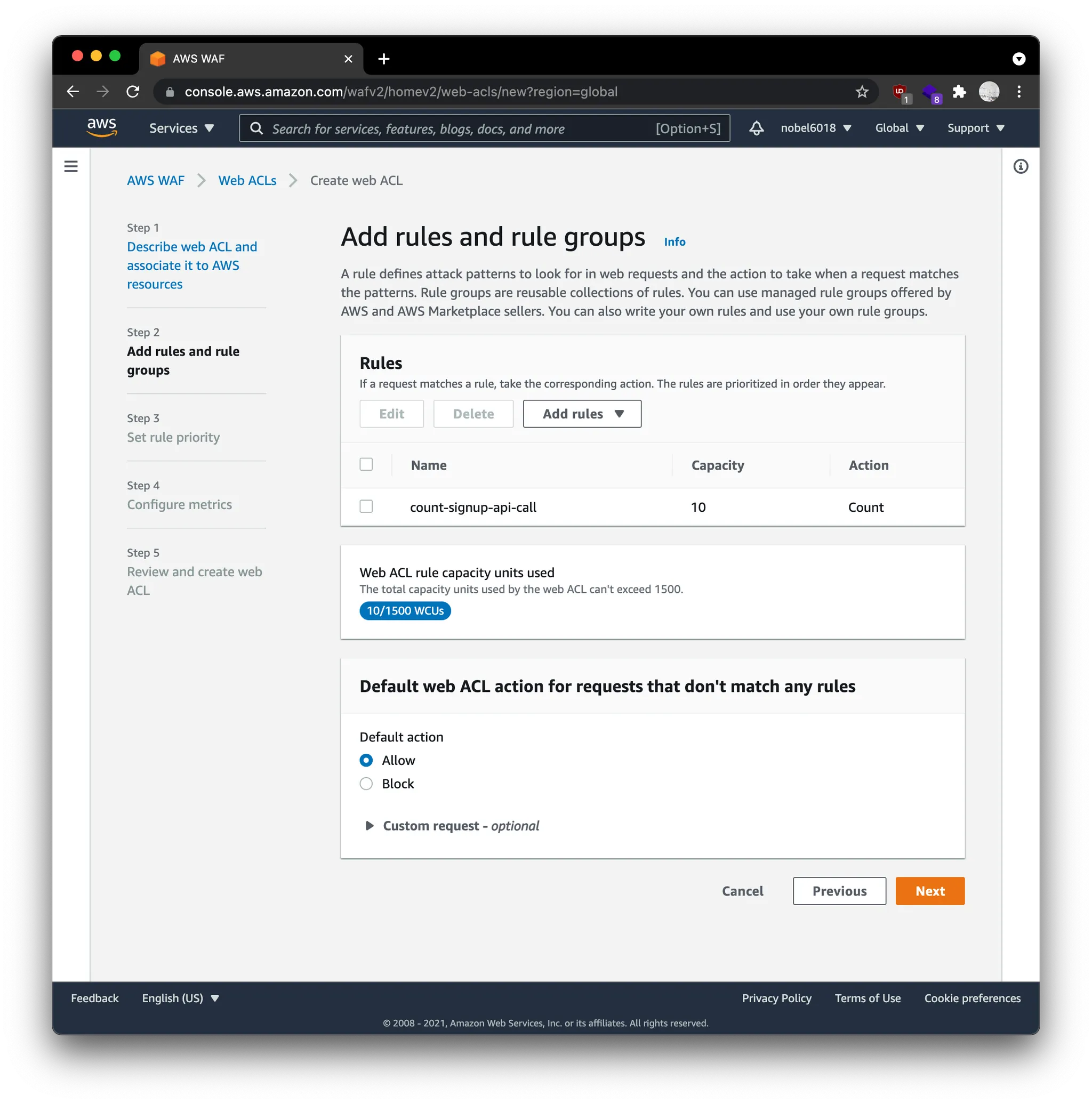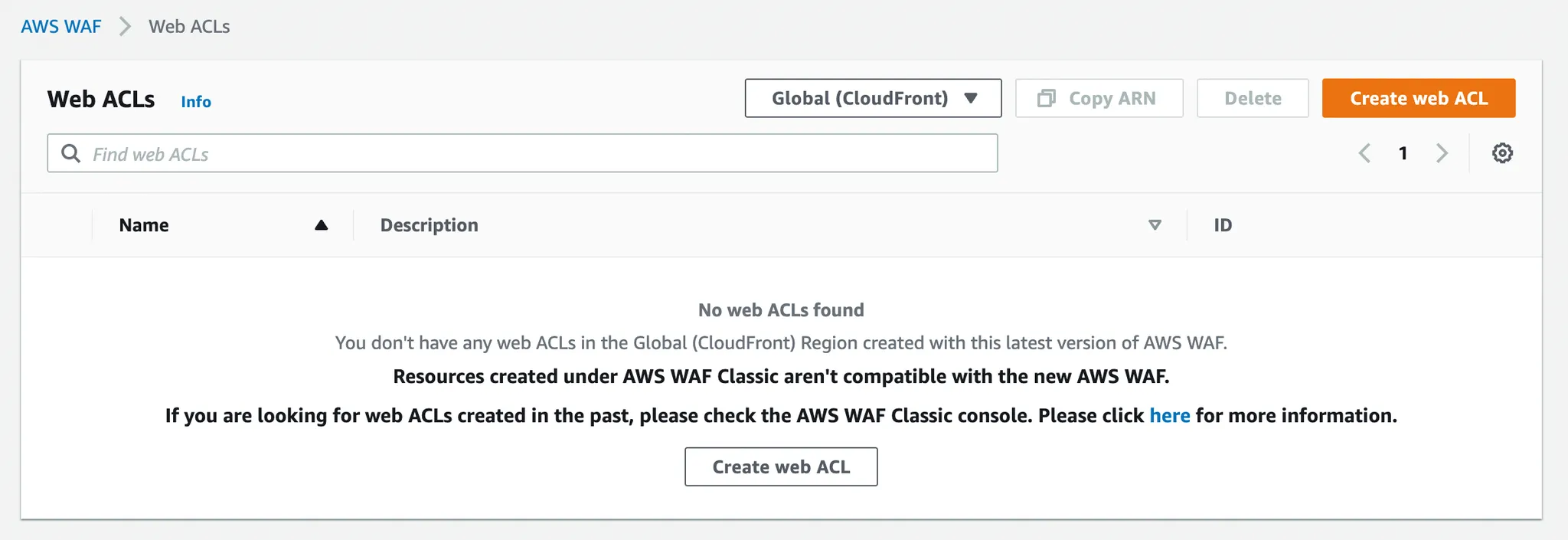 왼쪽 탭에서 Web ACLs 에 들어갑니다