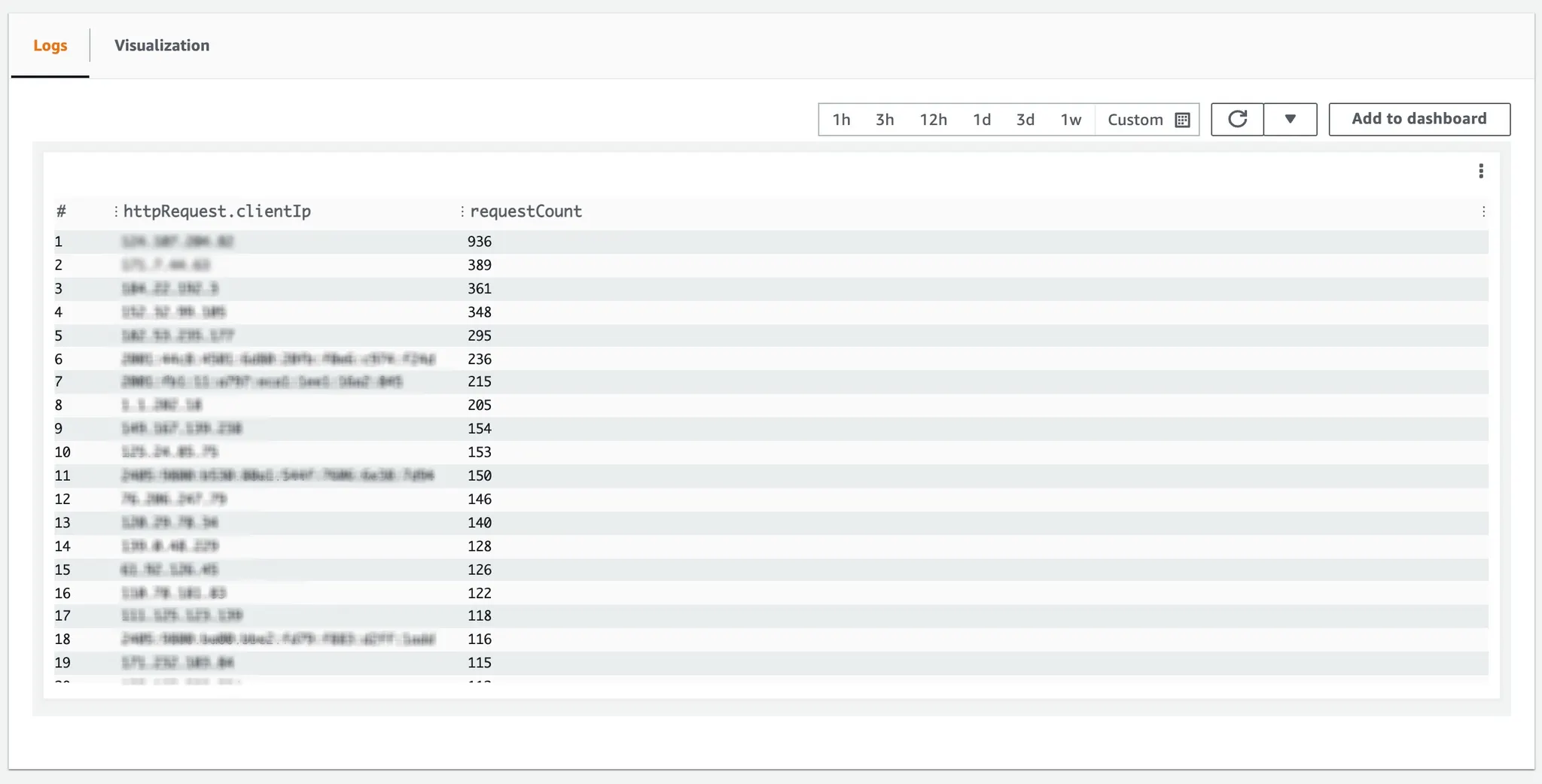 ACL에 들어와서 CloudWatch Log insights 기능을 사용해서 호출이 많은 IP를 확인합니다