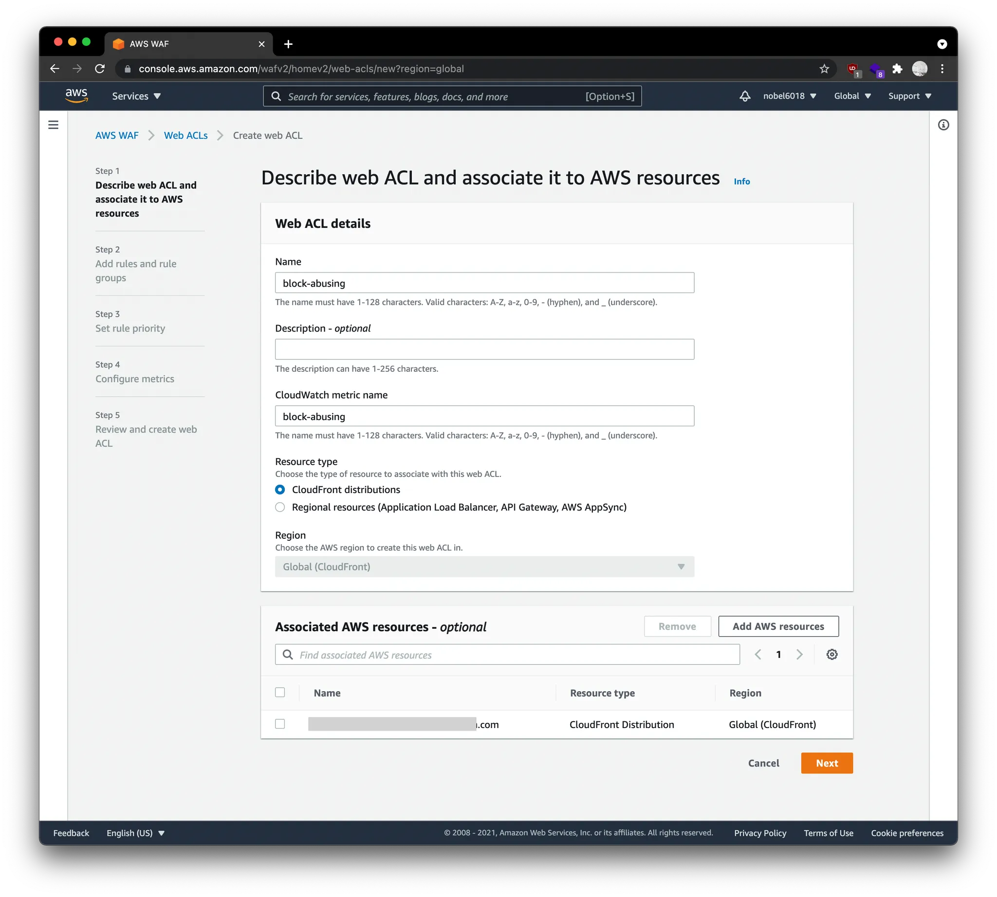 원하는 리전을 선택하고 Create Web ACL 을 누릅니다 저는 리전을 Global (CloudFront) 로 선택하였습니다