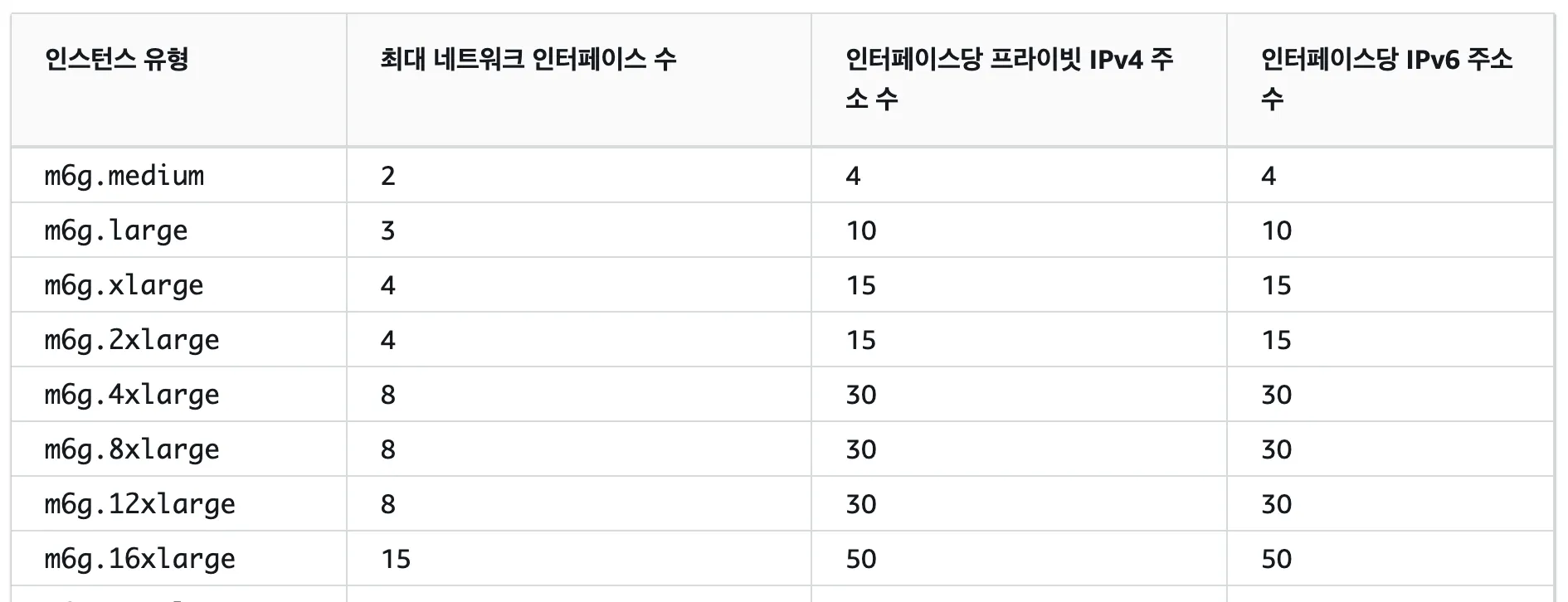 이유를 찾아보니 AWS 인스턴스 타입별로 (탄력적) 네트워크 인터페이스 별로 IP 주소를 할당할 수 있는 최대 개수가 정해져있습니다.