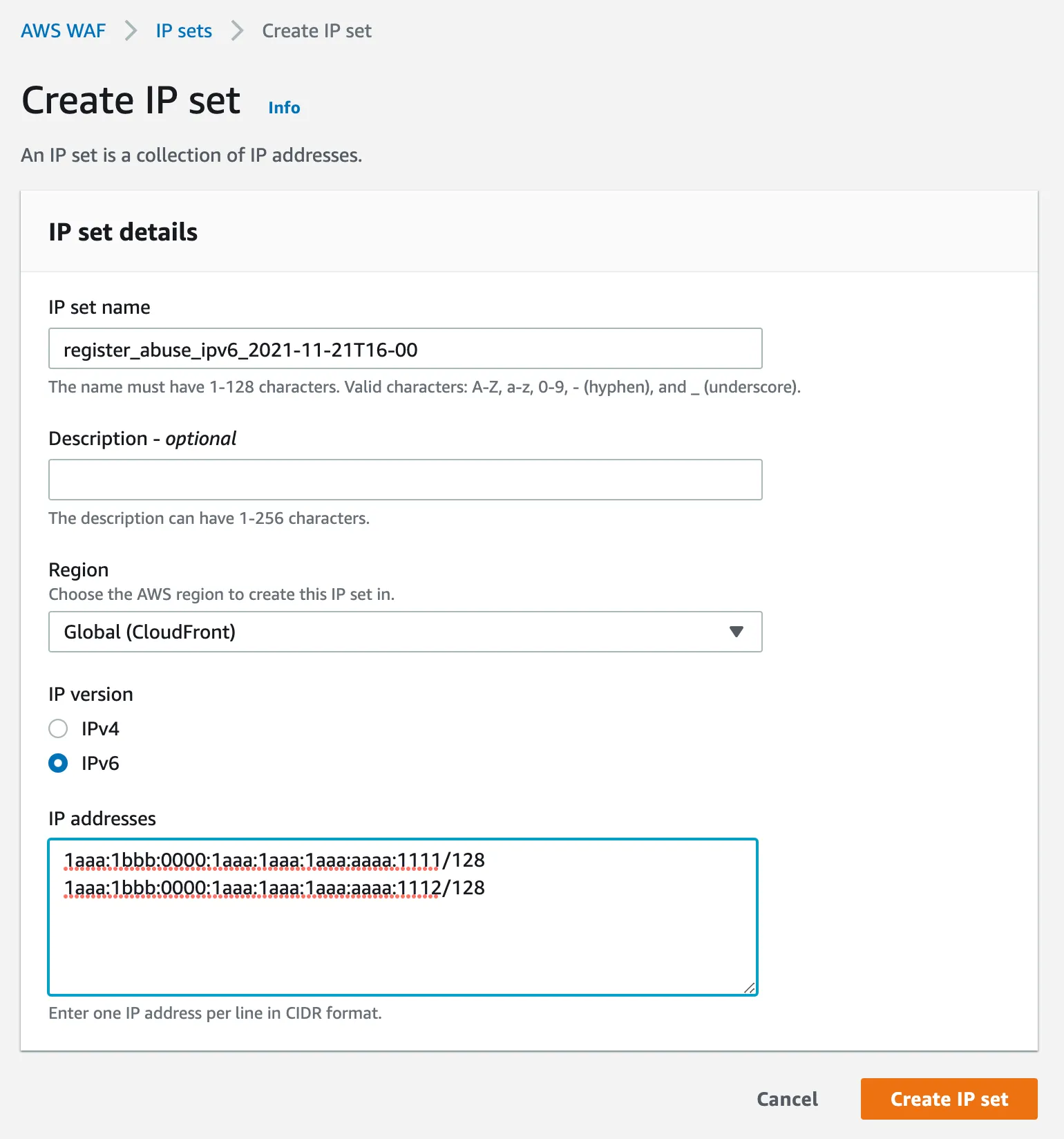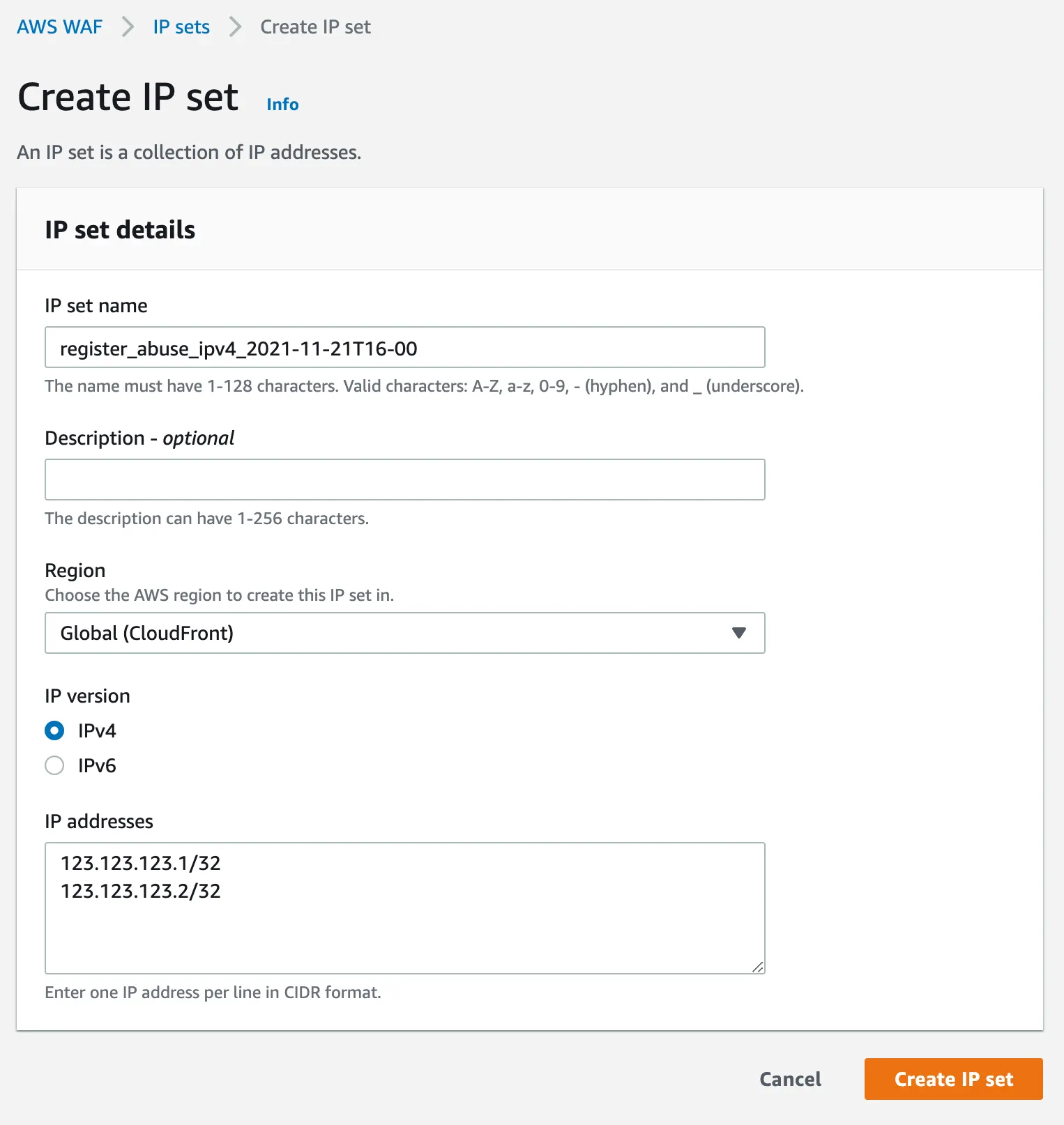 AWS WAF > IP Sets > Create IP set을 들어가서 IP set을 추가합니다
