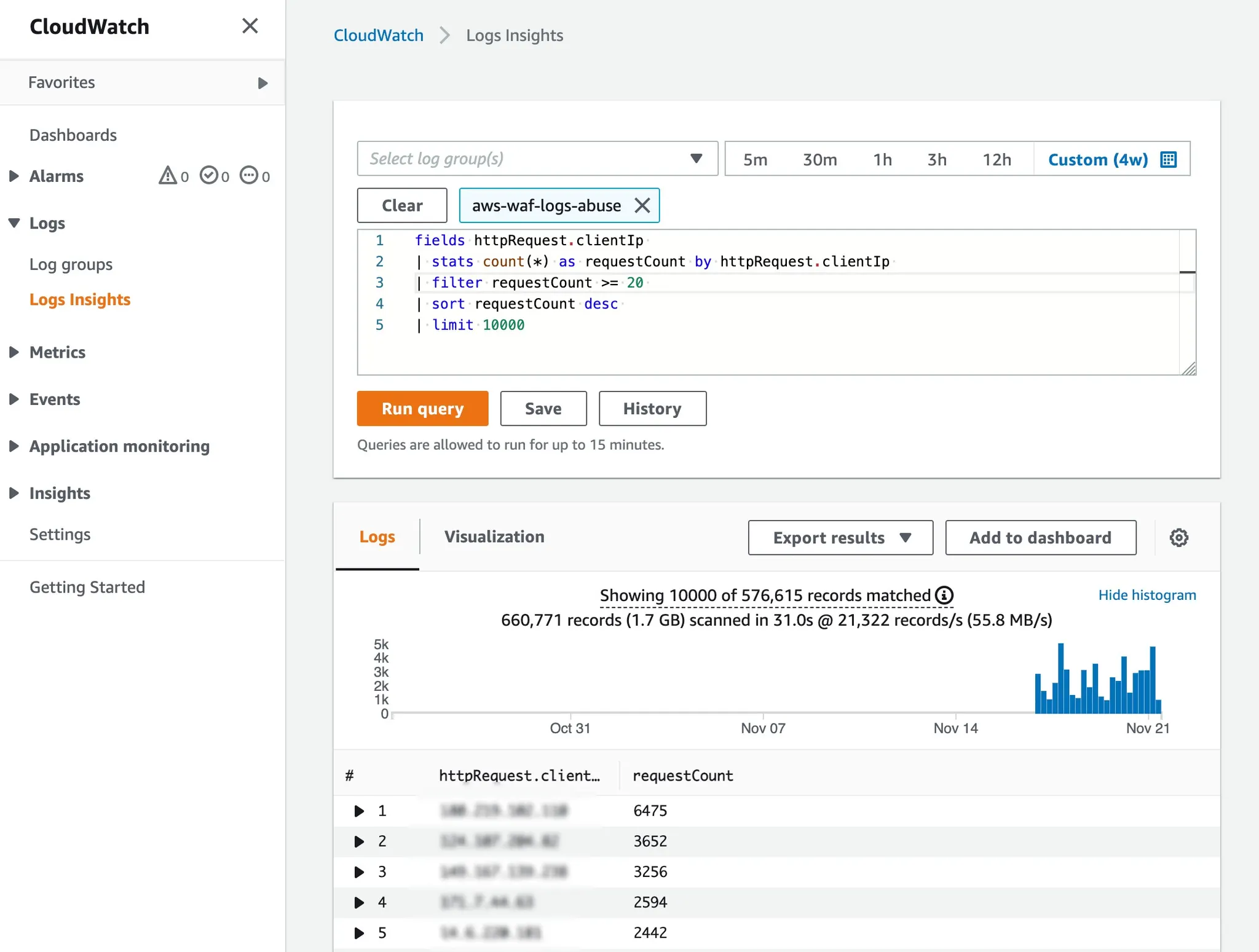| stats count(*) as requestCount by httpRequest.clientIp