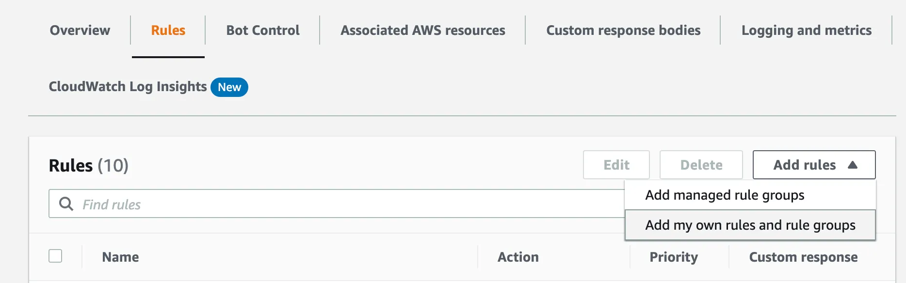 AWS WAF > Web ACLs에서 원하는 ACL을 선택합니다