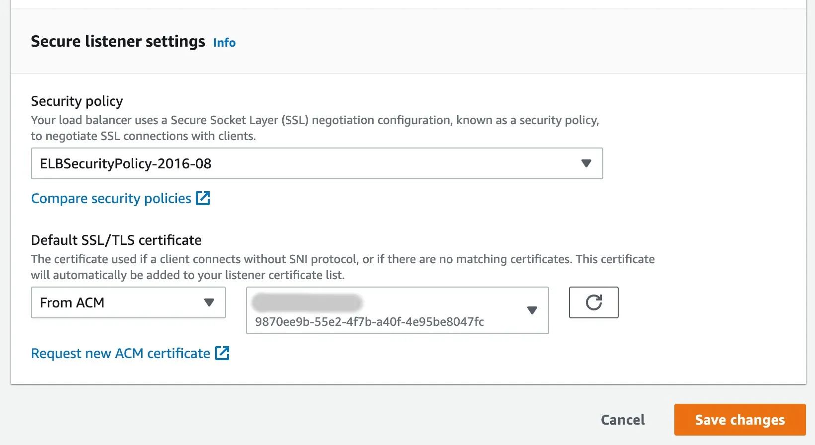 HTTPS(TLS 계층)를 적용하기 위해 SSL 인증서를 발급 받아서 선택해주시면 됩니다 (밑에 Request certificate 링크에 들어가시면 됩니다)