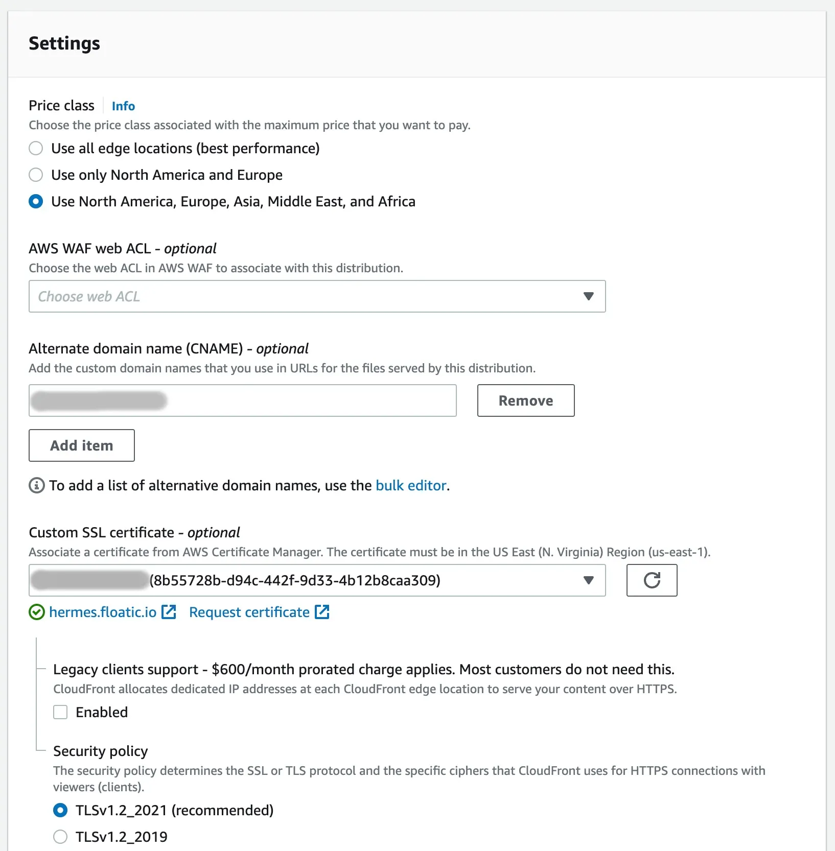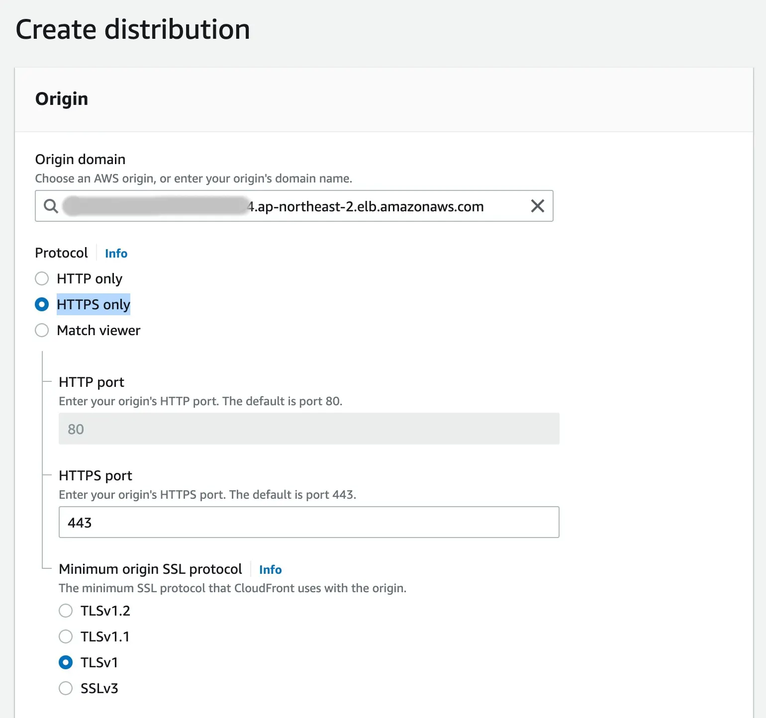 Origin domain에는 Load balancer를 선택하고, origin에 접근할 프로토콜은 HTTPS only를 선택합니다.