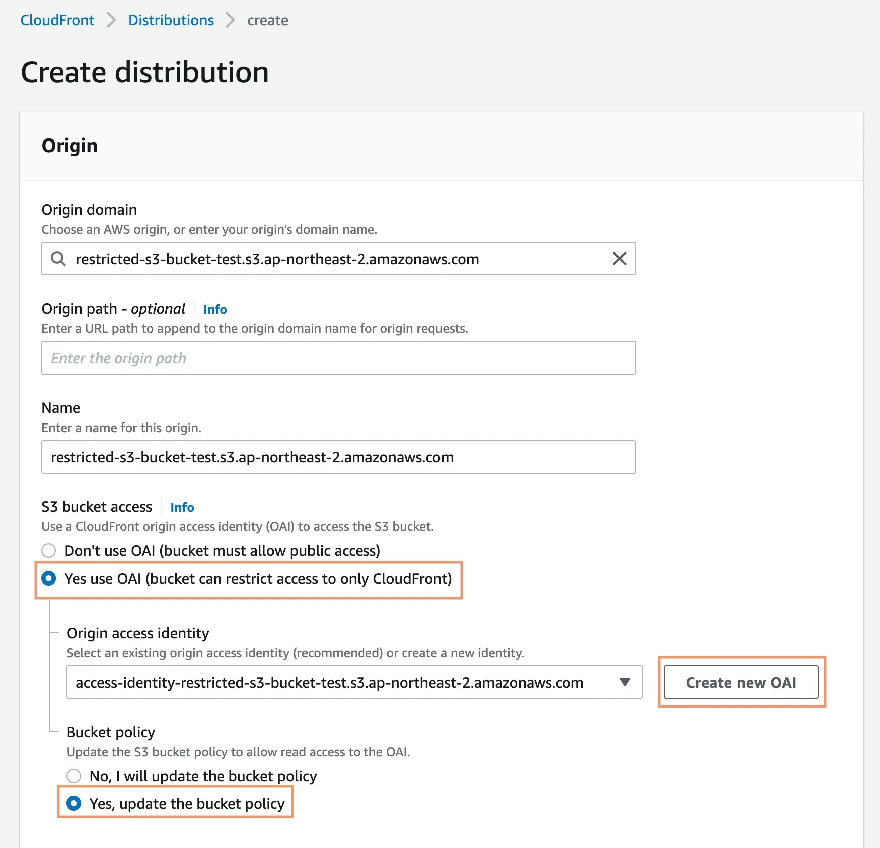 Create new OAI 버튼을 눌러서 OAI를 생성하고, ‘Yes, update the bucket policy’를 클릭하여 버킷의 policy가 자동으로 변경되도록 해줍니다.