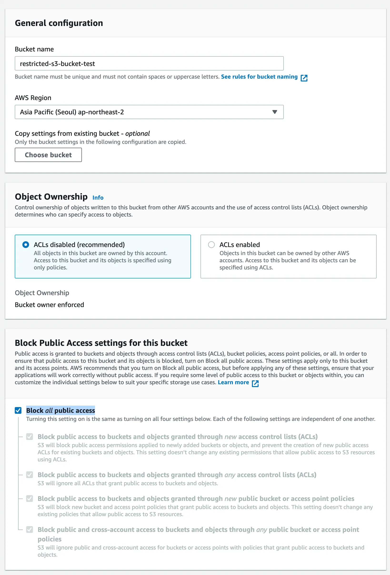 보안적으로 안전하게 ‘Block all public access’를 설정해서 외부의 접근을 차단합니다