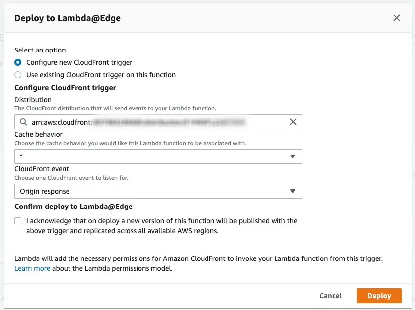 우측 상단 "Actions" > Deploy to Lambda@Edge 를 클릭해서