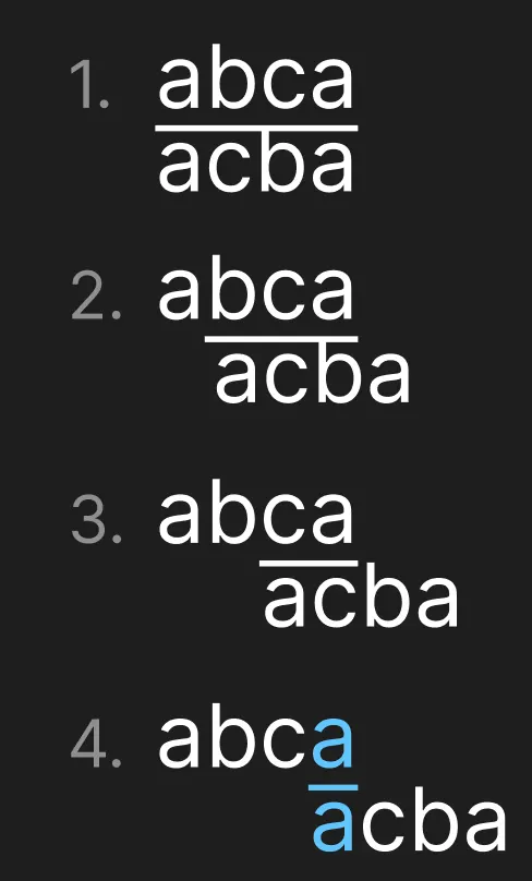 입력받은 원래 문자(abca)를 뒤집은 문자(acba)를 만듭니다. 그리고 원래 문자와 뒤집은 문자를 다음 그림과 같은 방법으로 비교합니다.