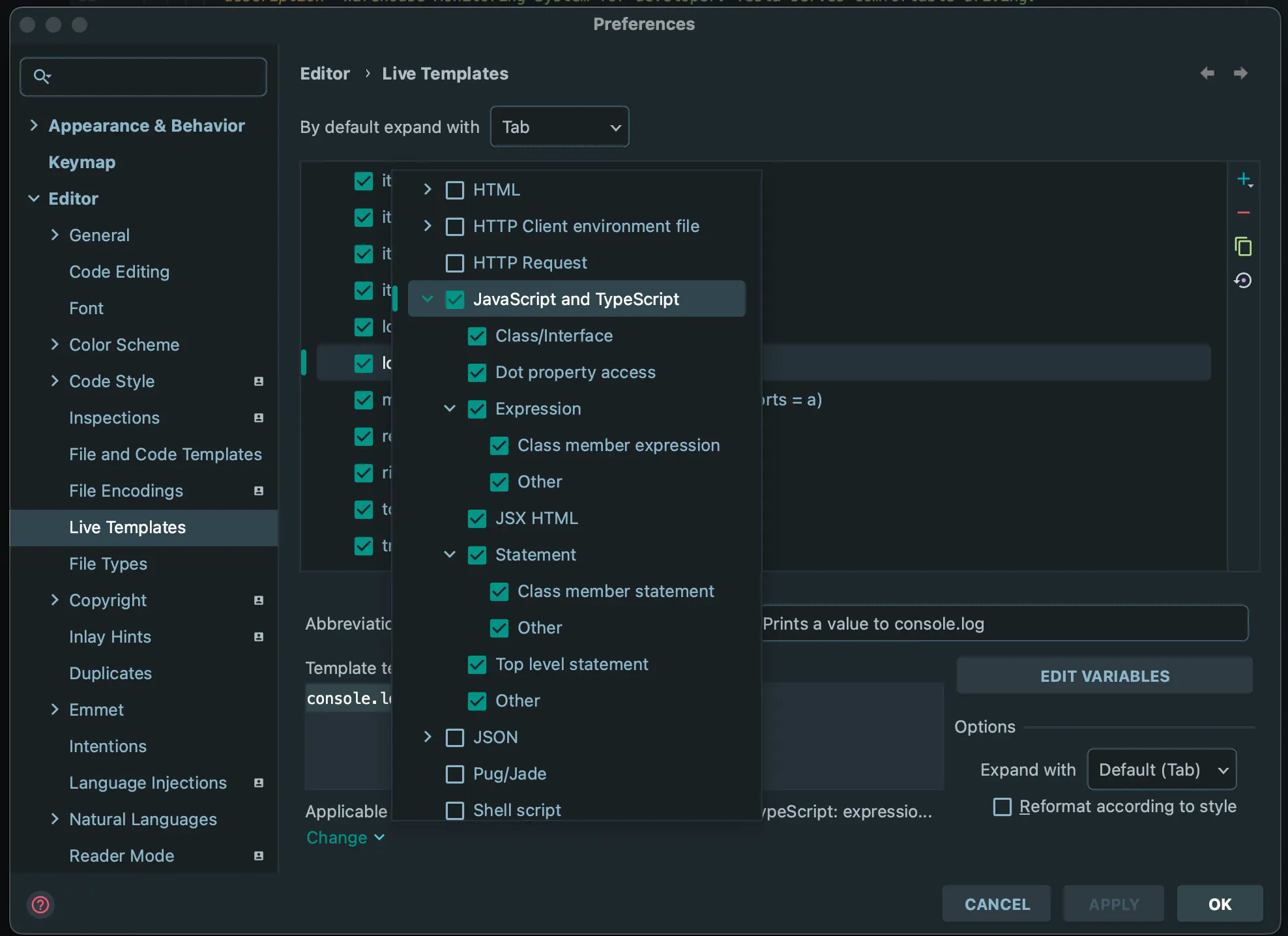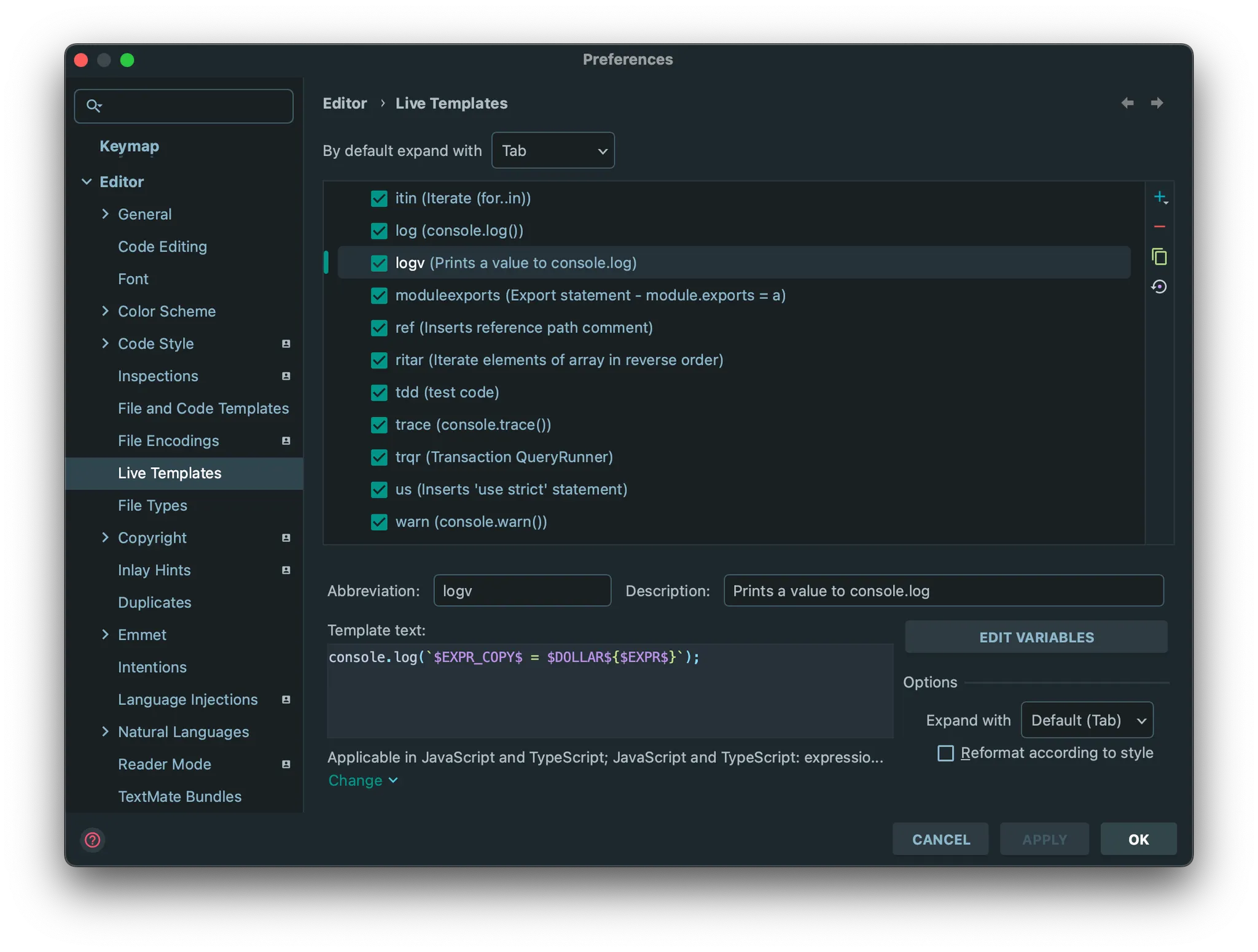console.log(`value = ${value}`) 를 사용하는 경우 번거롭게 타이핑을 해야해서 Webstorm (또는 Intellij)의 Live Template에 등록하였습니다.