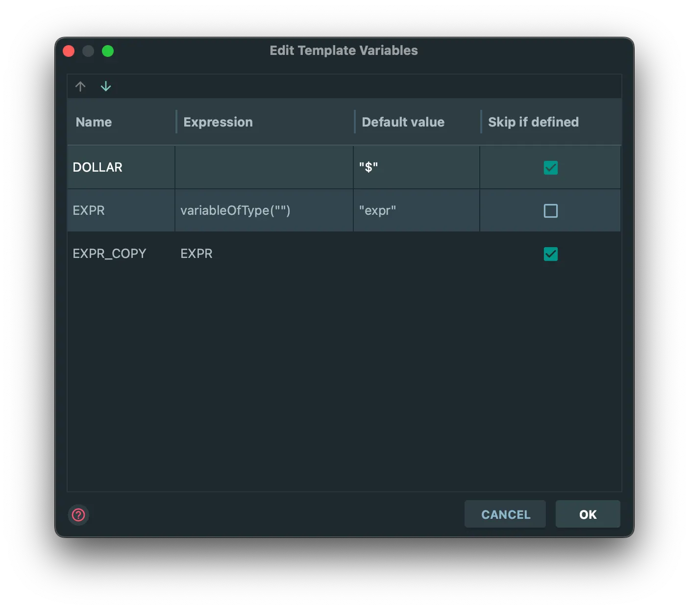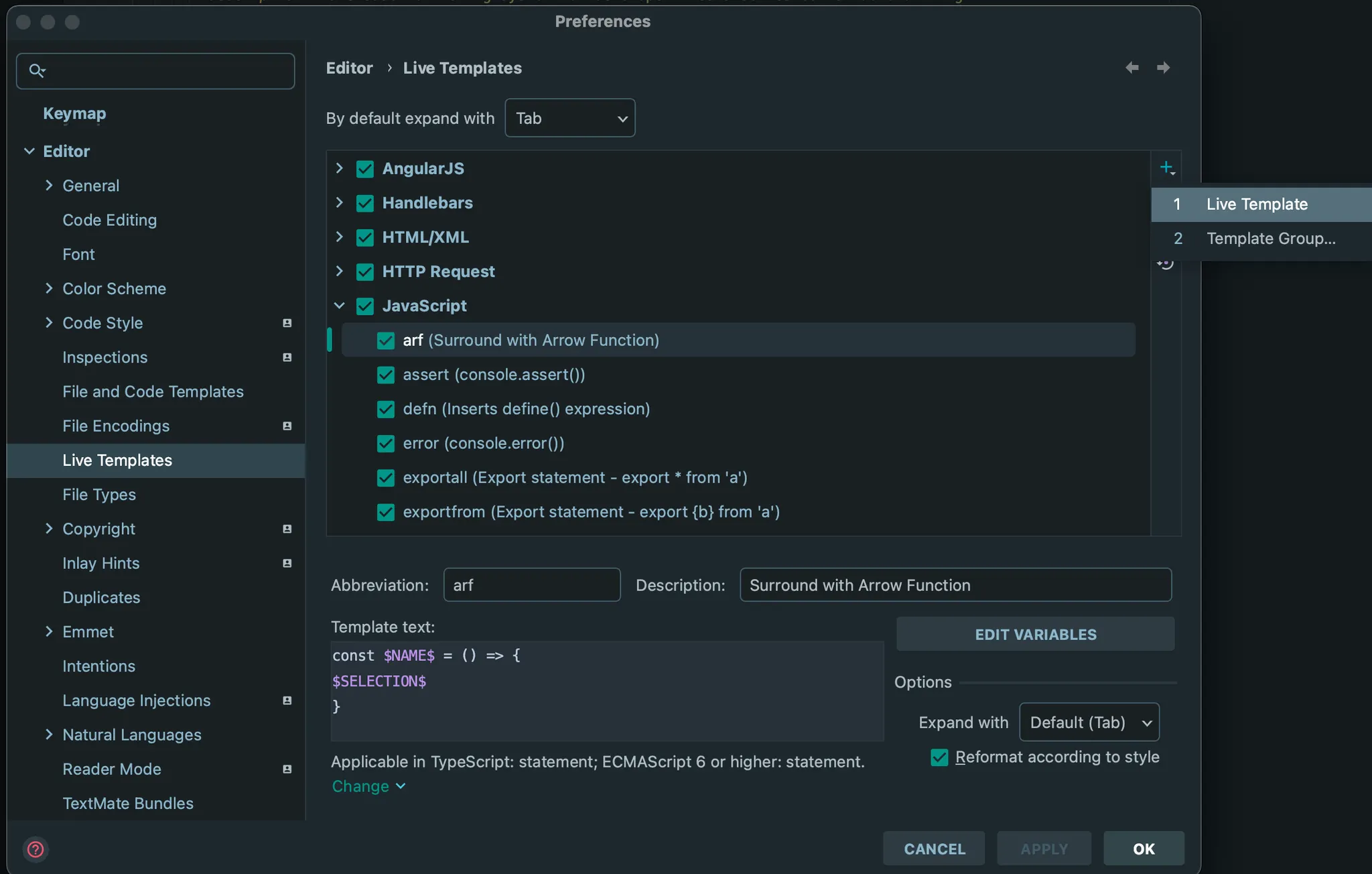 설정 (⌘ + ,)에서 Editor > Live Templates에 들어갑니다.