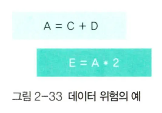 데이터 A를 필요로 하는 두 번째 명령어는 앞의 명령어가 끝날 때까지 동시에 실행되어서는 안 된다.