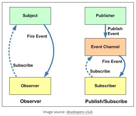 Observer 패턴에서는 동기 방식 (blocking)으로 동작하고, Pub/Sub 구조에서는 비동기 (async) 방식으로 동작합니다.
