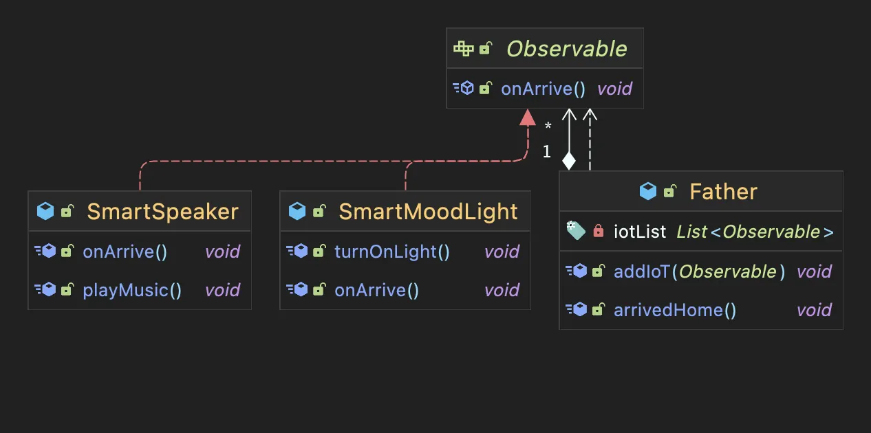 아빠 클래스는 IoT 기기들을 저장할 수 있는 리스트를 목록으로 가집니다. IoT를 등록하는 매소드가 있습니다. 그리고 집에 도착했을 때 IoT 기기들을에게 통보하는 arrviedHome 매소드도 있습니다.