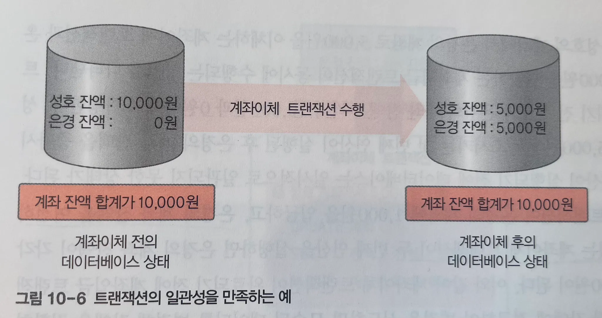 트랜잭션이 수행되는 과정에서는 데이터베이스가 일시적으로 일관된 상태가 아닐 수 있지만 트랜잭션 수행이 성공적으로 완료된 후에는 데이터베이스가 일관된 상태를 유지해야 한다.