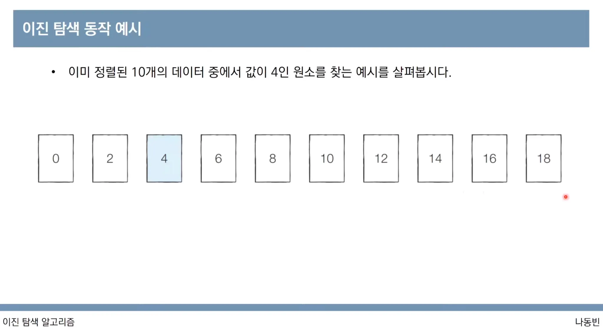 [문제 조건] 정렬된 10개의 데이터 중에서 값이 찾는값(target) 4인 원소를 찾습니다.