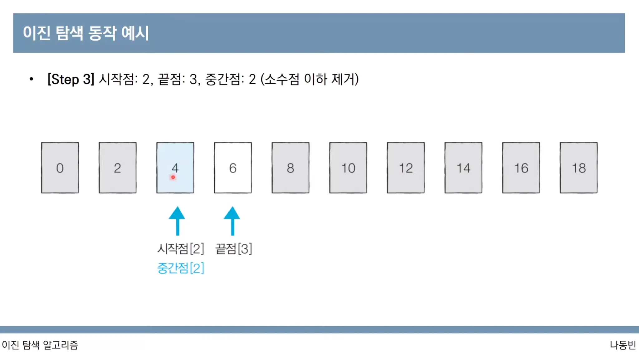 [Step3] 이번에는 중간점 값(arr[middle])이 target보다 작기 때문에 시작점을 중간점보다 하나 더 크게 설정합니다.