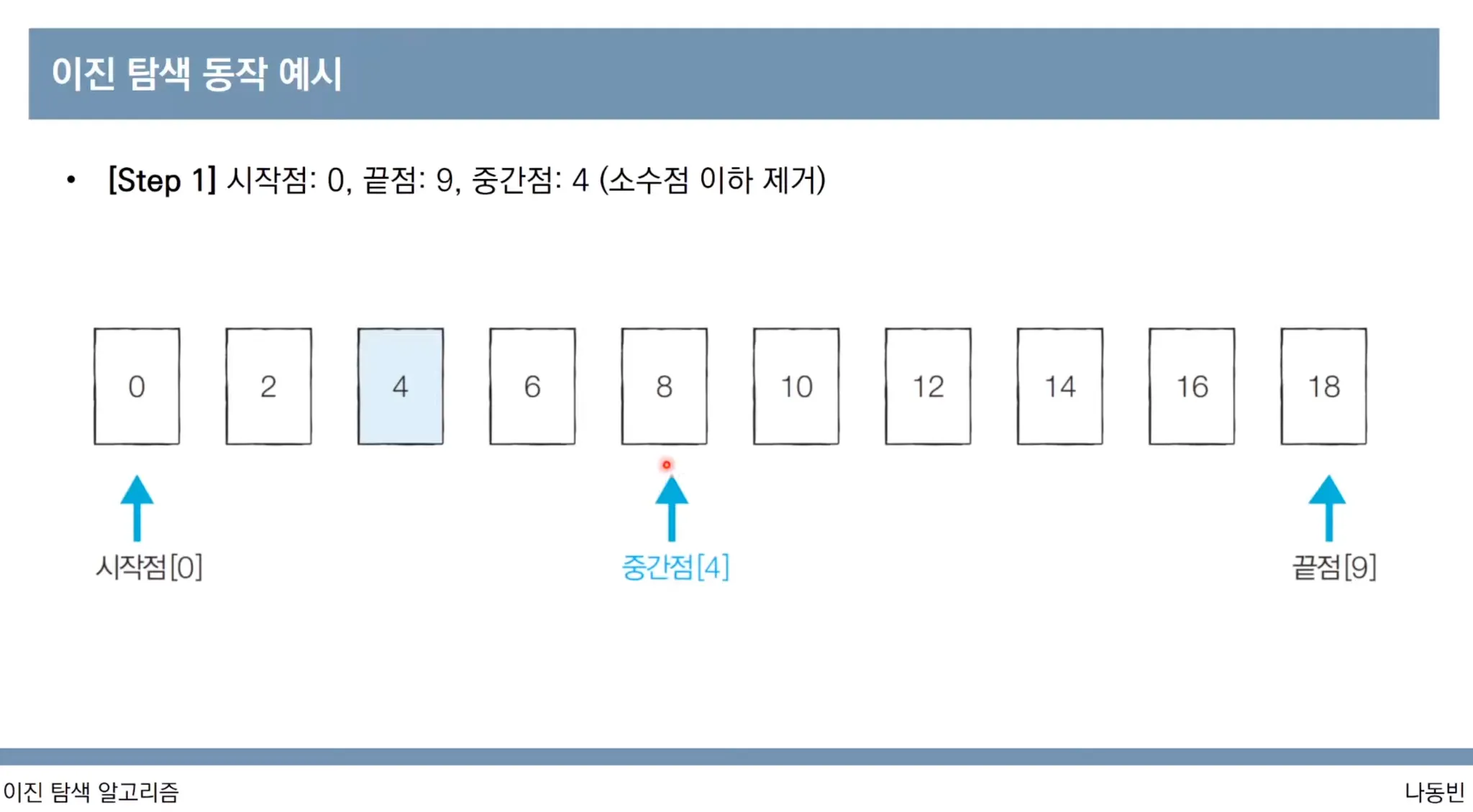 [Step1] 시작점(start)을 0번, 끝점(end)을 9번, 중간점(middle)을 (0 + 9) // 2 = 4 로 초기화 합니다.