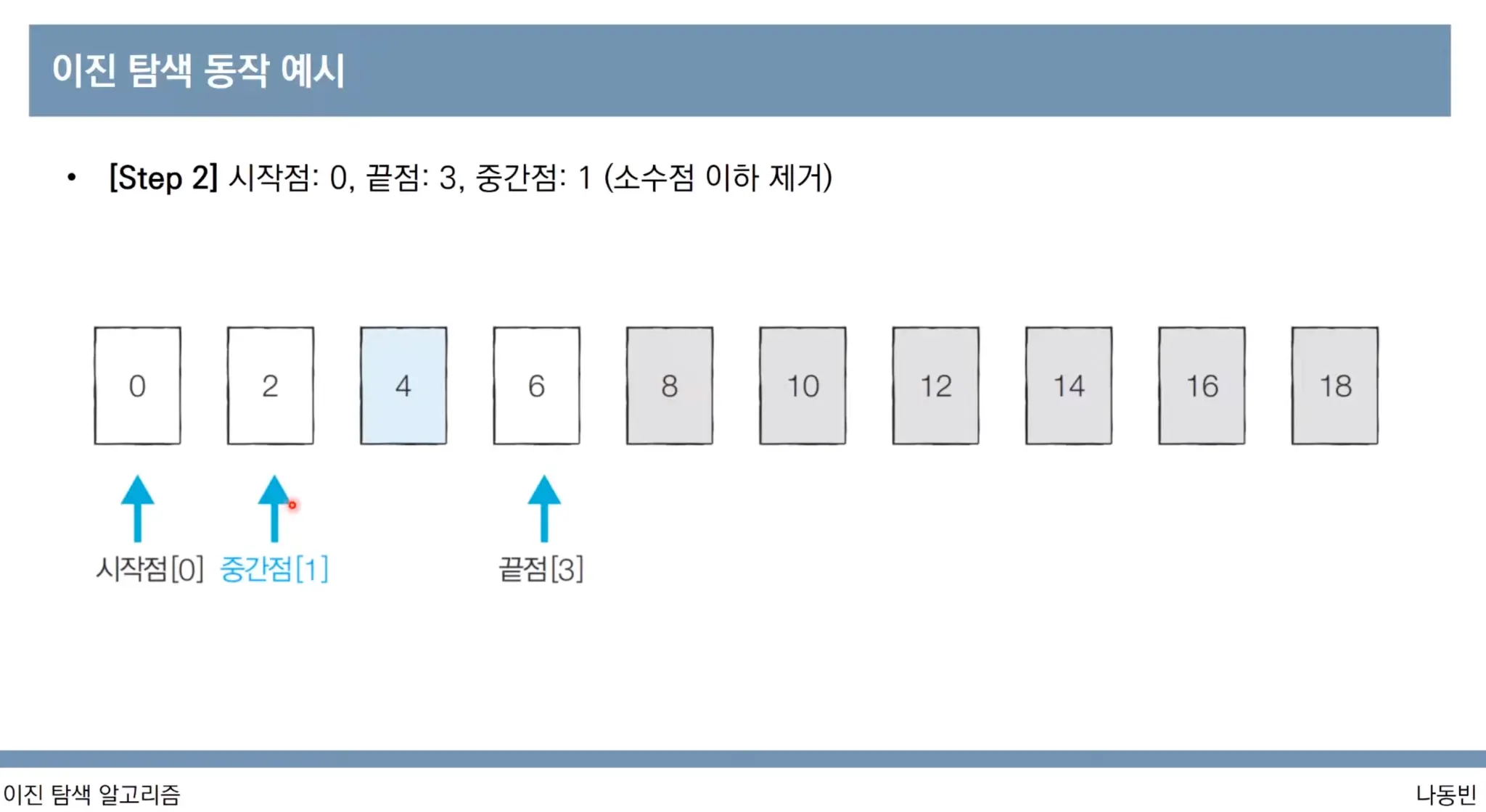 [Step2] target이 중간점의 값(arr[middle])보다 작기 때문에 끝점을 중간점보다 하나 작게 설정합니다