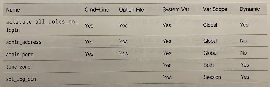 시스템 변수(설정) 값이 어떻게 MySQL 서버와 클라이언트에 영향을 미치는 지 판단하려면 각 변수가 글로벌 변수인지 세션 변수인지 구분할 수 있어야 한다.
