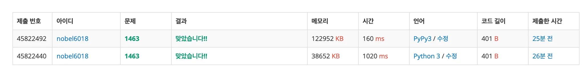 같은 코드인데 PyPy3로 제출했을 때가 Python3로 제출했을 때보다 6배 넘게 빠르게 동작합니다