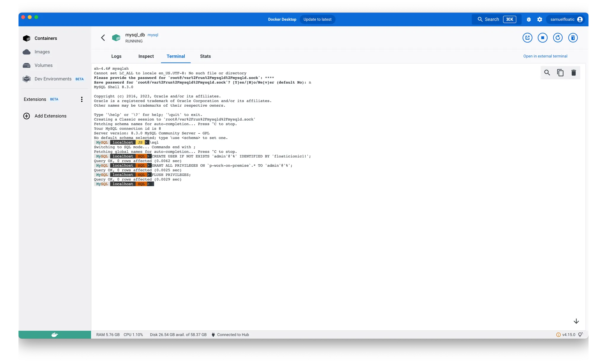 mysqlsh (password) 1234 (save password question) n \sql CREATE USER IF NOT EXISTS 'admin'@'%' IDENTIFIED BY 'floaticionic1!'; # 서비스명 유의! GRANT ALL PRIVILEGES ON `work-on-premise`.* TO 'admin'@'%'; FLUSH PRIVILEGES;